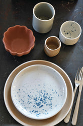 Émail buvard, blanc tacheté de bleu pour des pièces uniques à l’esprit arty.