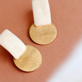 Les boucles d'oreilles CATHERINE sont composées d'un clou d'oreille de forme rectangulaire en résine epoxy & d'une médaille en acier inoxydable dorée pailletée ou dorée lisse. La forme très graphique apporte beaucoup d'élégance à ces boucles qui viendront s'accorder avec toutes vos tenues!