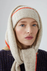 Son format triangle la rend naturellement élégante et pratique, tandis que l’alpaga lui confère un confort enveloppant, idéal pour les saisons fraîches. Le liseré contrastant souligne les bords et la petite étiquette "M" cousue signe cette pièce d’un détail discret mais affirmé.