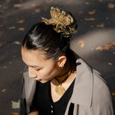 Maxi chouchou doré, fabriqué en France à la main, à partir d’un tissu upcyclé lumineux. Sa teinte entièrement dorée apporte une touche élégante et festive à toutes vos coiffures. C’est une pièce au beau volume, idéale pour mettre en valeur des cheveux moyens à épais, et parfaite pour briller au quotidien comme lors des grandes occasions.