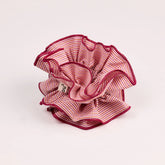 Maxi chouchou en vichy bordeaux, à fins carreaux prune et orange, fabriqué en France à la main, à partir d'un magnifique tissu upcyclé. L'imprimé vichy est un intemporel, réveillé par une bordure rose fuchsia. C'est une pièce qui a du volume, idéale pour des cheveux moyens à épais.